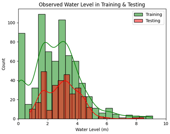 The classification results in Table 12 indicate that the Isolation Forest achieved high recall rates at most stations for detecting water level outliers at a contamination level of 0.01, except for at the Veunkham station. Figure 7 shows the distribution of observed water levels for station Veunkham during the training and testing periods. In the training period, the left tail of the distribution exhibited a sharp spike at zero values. This likely explains why these extreme values were not identified as minimum water level outliers by the Isolation Forest (Figure 5, right). Since the model learned that such zero values were common rather than unique, it did not isolate them as outliers. Consequently, the recall rate for station Veunkham was low, as the model failed to classify the zero water level values as outliers.