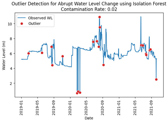 Results of classifications for outlier detection of abrupt water level change using unsupervised Isolation Forest model.