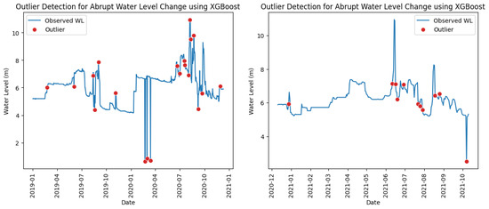 Abrupt water level change outliers identified at station Thalad using XGBoost model in training (left) and testing (right) periods.