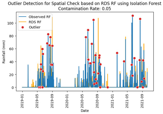 Results of classifications for outlier detection of rainfall spatial check using unsupervised Isolation Forest model.