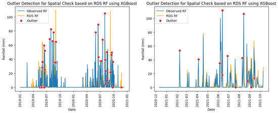 Rainfall spatial check outliers identified at station Pakkayoung using XGBoost model in training (left) and testing (right) periods.