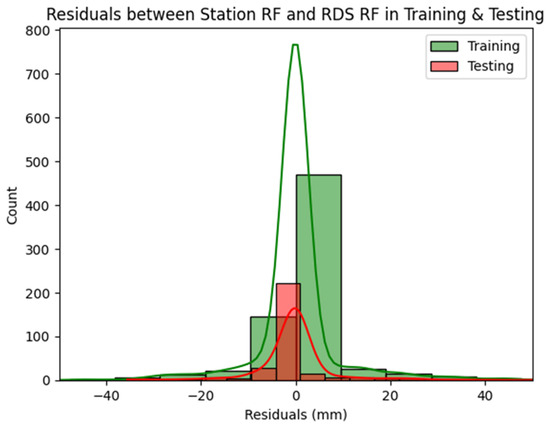As discussed earlier, the performance of the Isolation Forest model is highly dependent on the shape of the data distribution, particularly the left and right tails. The bell-shaped distribution of the differences between target rainfall and RDS rainfall, as shown in Figure 14, explains the excellent performance of the model in detecting outliers during the rainfall spatial check. In Figure 14, positive and negative residuals indicate overestimation and underestimation of the target station rainfall relative to the corresponding RDS rainfall. The absence of sharp spikes in both tails allowed the Isolation Forest to readily identify and isolate data beyond the lower (left tail) and upper (right tail) thresholds as outliers.