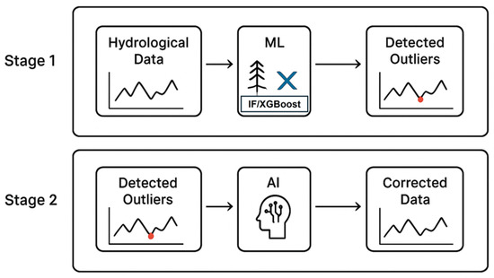 Figure 15 illustrates the schematic framework proposed for hydrological data quality control in TC member countries. In the present study, stage 1 of the framework is addressed, where the machine learning methods Isolation Forest and XGBoost were employed to detect outliers in hydrological data. Stage 2, which will be the focus of future work, involves correcting the detected outliers using AI techniques such as LSTM Autoencoders. This two-stage approach aims to establish a comprehensive AI-based system for hydrological data quality control across TC member countries.