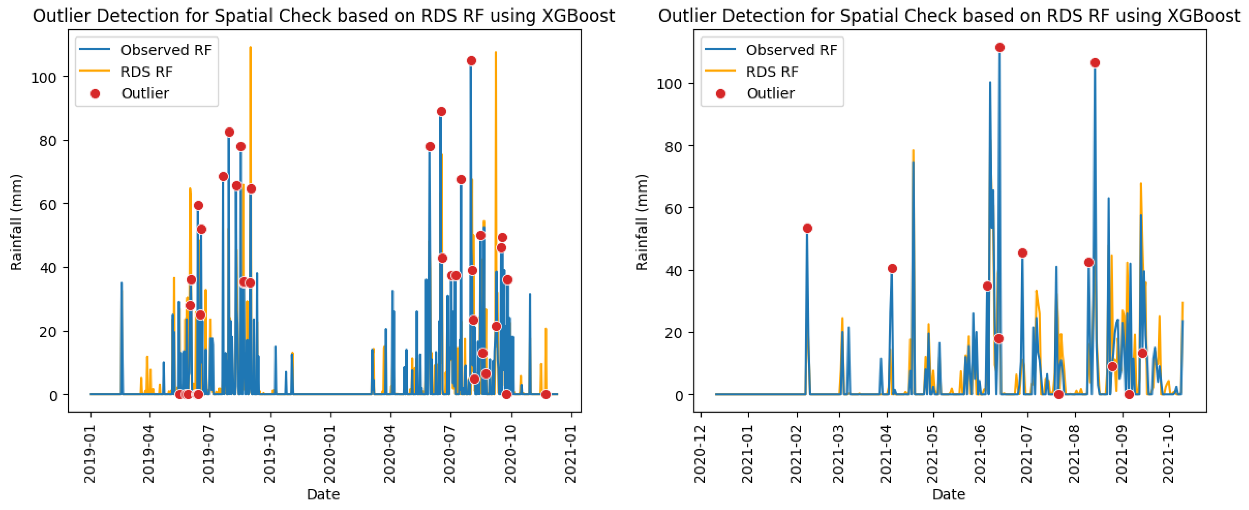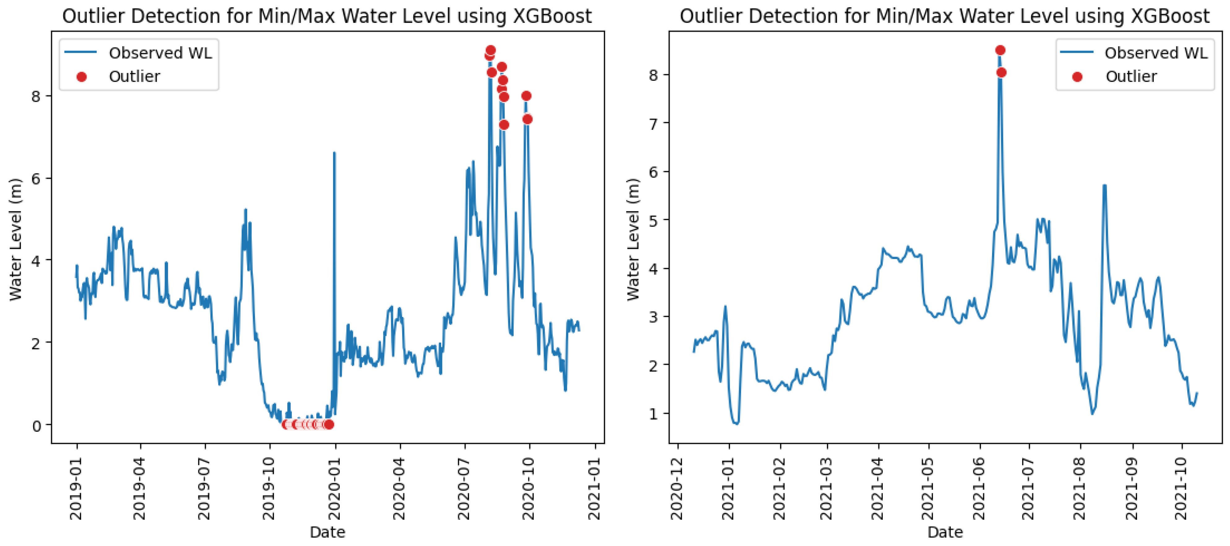 | XGBoost (Supervised) | - Achieves high precision and recall when sufficient labeled datasets are available. - Consistently outperforms Isolation Forest in detecting both minimum and maximum water level outliers. - Performs robustly across statistical, duration, and slope checks. - Less sensitive to data distribution shape compared to Isolation Forest | - Requires labeled outlier data for training, which may not be available for all stations. - Performance deteriorates when trained with insufficient or unrepresentative labeled data. - More computationally intensive than Isolation Forest for large datasets. - May overfit if the training dataset is small or noisy. |