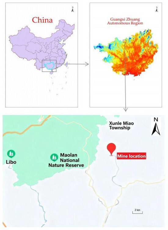 The mining region is in a subtropical monsoon climate zone, characterized by significant rainfall (1750 mm of average annual precipitation and 156 mm of maximum daily rainfall). The topography of the region includes peak clusters, karst depressions, and karst valleys. These are separated by ridges with substantial elevation changes. During the wet season, flash floods occur with discharge rates reaching up to 22 ± 5% m3/s. Conversely, during the dry season, the flow of the mountain river reduces significantly to mere trickles, sometimes as low as 0.2 ± 5% m3/s. The geographical location map of the mining area is shown in Figure 1.
