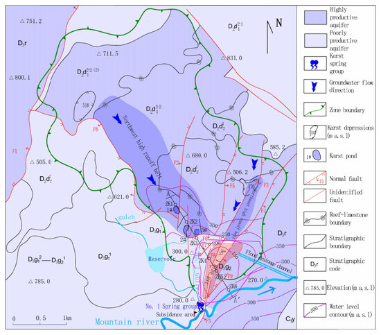 The aquifer, characterized by high productivity, consists of limestone, bioclastic limestone, dolomite, dolomitic limestone, and reef limestone (inclusive of stromatoporoid bioherms). This primarily correlates with the Devonian Rongxian Formation (D3r), Upper Dadongling Formation Bed D2d21, Lower Dadongling Formation Bed D2d12−2, and Lower Dadongling Formation Subbed D2d12−2(2). The aquifer, which is only weakly productive, is primarily composed of thin-bedded limestone, banded limestone, marlstone, and argillaceous limestone. It spans five stratigraphic units: Upper Guilin Formation Bed D3g21, Lower Guilin Formation Beds D3g11–D3g13, and Upper Dadongling Formation Bed D2d22.