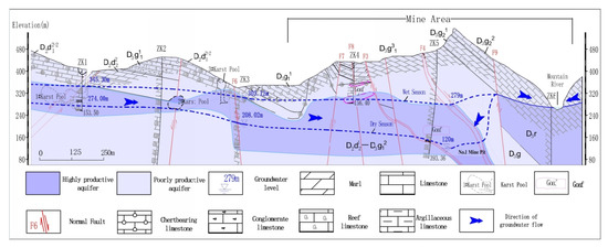 The mining region is characterized by intricate geological formations. The exposed strata include the Middle Devonian Donggangling Formation, Upper Devonian Guilin Formation, Upper Devonian Rongxian Formation, and Lower Carboniferous Yaoyunling Formation. According to the hydrogeological survey, the mining area is an independent hydrogeological unit, which is bounded by watershed and impermeable faults (Figure 2 and Figure 3). The terrain of the mining area is characterized by karst peaks surrounded by mountains on three sides, with a catchment area of about 13.3 km2. In the northern part of Fault F6, extensive outcrops expose limestone, bioclastic limestone (D2d2−2(2)), early reef limestone (D2d12−2), and late reef limestone (D2d21) covering ~10.0 km2. The remaining 3.3 km2 area primarily consists of marlstone and mudstone formations (D2d22 and D2d12−1).