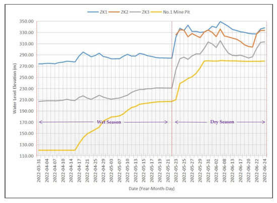Figure 4 is the observation data of mine water level from March to June in 2022, which shows that during the normal season under active mining, the lowest water levels at observation points ZK1 and ZK3 were +274 ± 0.05 m and +208 ± 0.05 m, respectively, while the pit water level stood at 120.0 m. However, during the wet season, the highest water levels reached +349.5 ± 0.05 m (ZK1), +336.1 ± 0.05 m (ZK2), and +313.2 ± 0.05 m (ZK3), while Pit No. 1 had a water level of +280 m and groundwater overflow was discharged via storm drain channels. These observations indicate that the depression cone formed by intensive dewatering during production has expanded beyond ZK1, resulting in a much steeper hydraulic gradient from upstream ZK1 to the mine pit than that during the wet season. On May 18, as the wet season began, mining operations were suspended due to a dramatic surge of groundwater from northwestern runoff zone, and the pit water levels rose rapidly six hours later, indicating strong hydrogeological connectivity between the mine workings and the northwestern flow paths.
