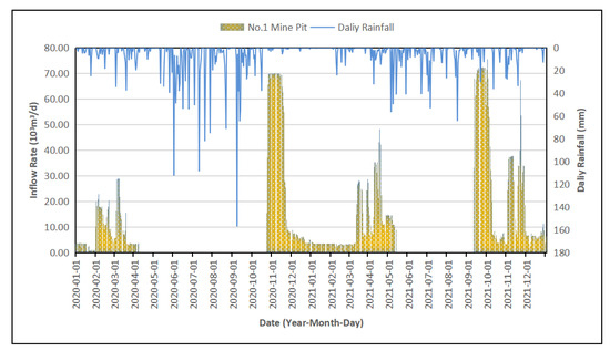 Daily rainfall and inflow rate of No. 1 mine pit from 2020 to 2021.