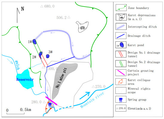 Hydrogeological investigation reveals that the karst depression at elevation + 470 m acts as a regional catchment area, which collects overland flow and generates temporary ponded water during wet seasons. The infiltration estimated by recharge area calculations recharges through the NE-trending runoff belt into Mine No. 1, and contributes approximately 10% of total mine water inflow. To reduce this component, an engineering solution has been proposed, which consists of a pump station inside the depression to actively dewater the rainfall accumulation during the wet seasons, and a discharge pipeline cross the mountain spine with a hydraulic head differential of about 100 m (total length: 300 m), terminating in extraneous stream valleys northeast of the mining unit. Concurrently, high-elevation surface conduits adjacent to the depression will be geotechnically sealed, thereby reducing direct meteoric recharge to aquifer systems.