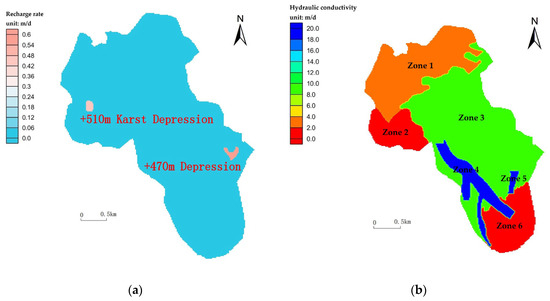 The study area primarily receives atmospheric recharge. Due to widespread karst features, including depressions, sinkholes and collapse structures distributed across northern and western regions, intensive surface runoff convergence under heavy rainfall events significantly amplifies regional infiltration rates. The two large-scale depressions (Figure 7a) are representative of all topographic anomalies that lead to dramatic increases in recharge in the western and northern parts, where it is necessary to assign larger infiltration. After the treatment measures, the effective engineering control has decreased the regional infiltration, and the recharge of depressions gradually returned to normal.