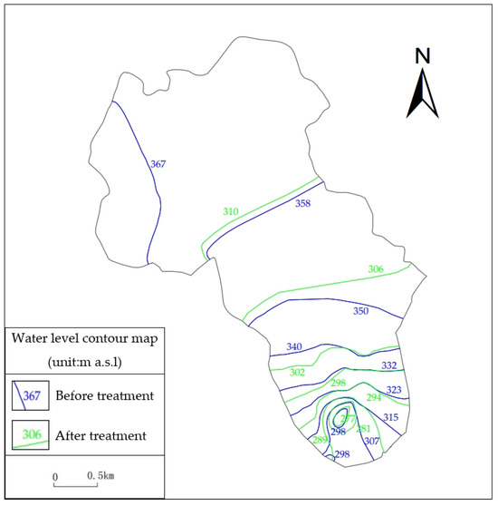 After treatment, the regional water tables decreased, and the recharge volumes of the two depressions were greatly reduced. Two drainage tunnels were constructed, namely Tunnel No. 1 between Pond No. 1 and Pond No. 2 (elevation +300 m) and Tunnel No. 2 from Pond No. 2 to Gully No. 1. Curtain grouting was also performed at Spring Group I to block river backflow, so Spring Group I became an impermeable boundary. The overflow outlet at Pond No. 2 lost its discharge function, and the recharge contributions of the two depressions were thus reduced.