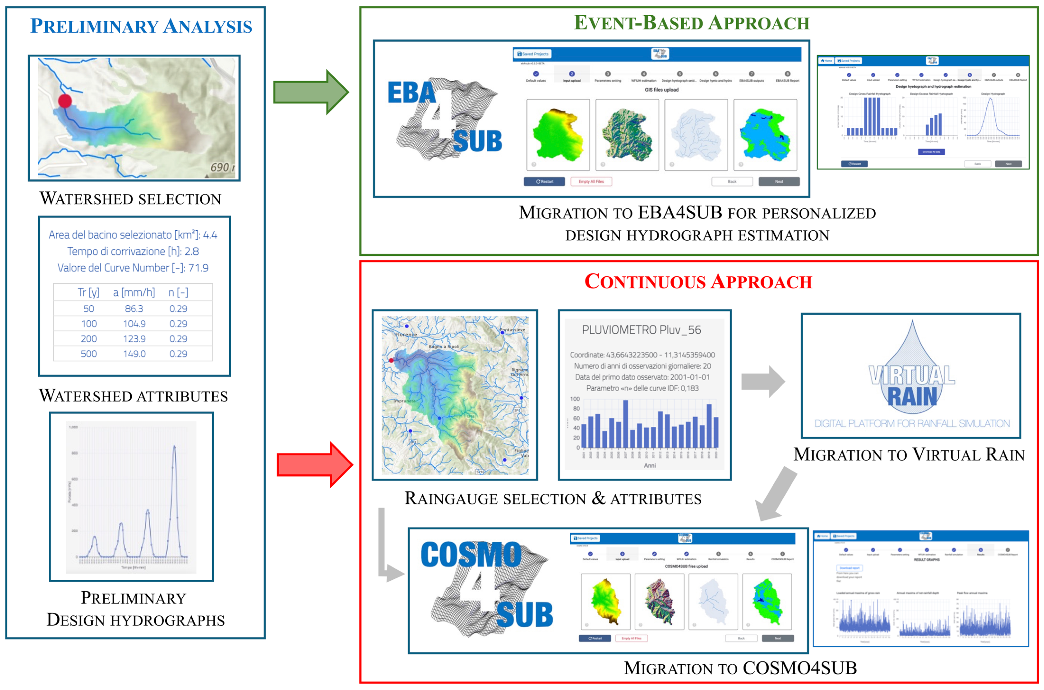 The platform integrates three hydrological models developed for small and ungauged catchments: EBA4SUB (event-based rainfall–runoff model), COSMO4SUB (continuous rainfall–runoff model), and Virtual Rain (stochastic rainfall generator). Each balances robustness with parsimony, and together they provide a suite of modelling options for both event-based and continuous simulation contexts. The platform offers a streamlined and user-friendly interface, enabling practitioners to efficiently prepare inputs and perform simulations without extensive GIS or programming expertise.
