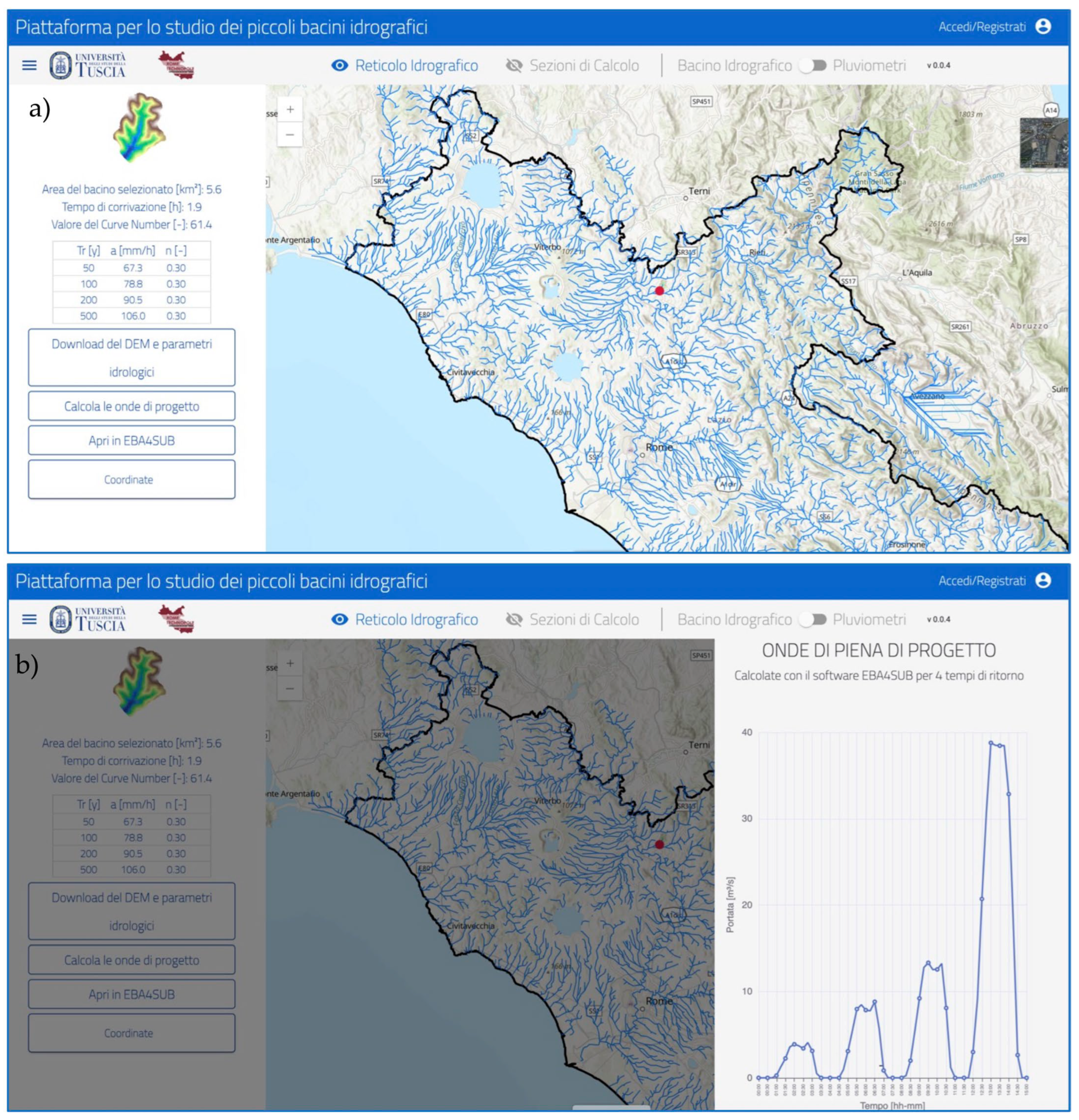 The digital platform has been implemented across the Lazio Region in Italy (17,242 km2), with a specific focus on analyzing small to medium-sized watersheds—particularly those with a contributing area of less than 400 km2.
