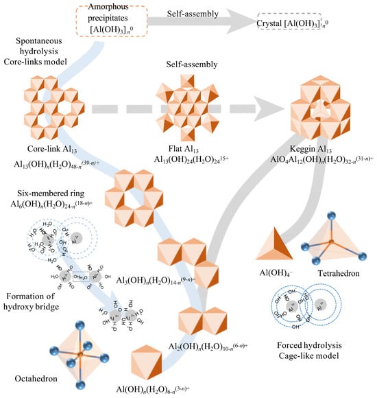 Meanwhile, the “cage-like” model depicts the forced hydrolysis of aluminum salts in an alkaline environment. Through self-assembly, sub-steady-state speciation of polynuclear aluminum forms, characterized by a central tetrahedral AlO4 unit [30].