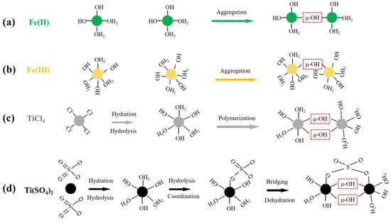 The schematics of Fe(II) (a) and Fe (III) coagulation (b) as well as the hydrolysis reactions of TiCl4 (c) and Ti(SO4)2 (d). The structure enclosed by the red dashed box in the figure is the μ-OH bond.