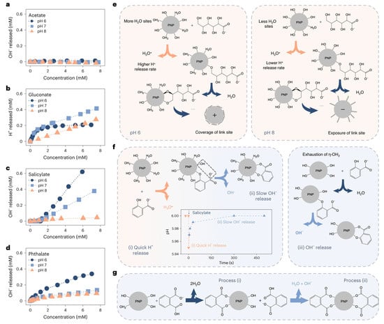 Reaction between aluminum hydroxide precipitates and functional groups. Titration curves for the aluminum precipitates on addition of acetate (a), gluconate (b), salicylate (c) and phthalate (d); The corresponding schematic of the adsorption of the four organic matter by precipitated nanoparticles (PNP) (e–g) (Reproduced from Ref. [29], with permission from Springer Nature, 2024).
