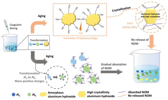 Although relatively few studies on the mechanism of floc aging have been conducted to date, this review has systematically summarized the existing research and put forward our own hypotheses. As shown in Figure 4, the key to changes in floc activity during floc aging lies in changes to the species and crystal structure of the coagulant. As mentioned above, aluminum-based coagulants undergo a series of reactions such as hydrolysis, polymerization and precipitation, thereby forming various aluminum species such as Ala, Alb and Alc. However, these aluminum species are not stable and undergo transformation during aging. For example, Ala can transform into Alb, which can subsequently become Alc. As for amorphous precipitated Alc, it can also crystallize into aluminum hydroxide with high crystallinity [79]. Since Ala, Alb and Alc correspond to coagulation mechanisms of electric double layer compression, charge neutralization and sweep flocculation, respectively, changes in aluminum species alter the pollutant removal mechanism, leading to the adsorption or release of organic matter. Moreover, the mechanism underlying the change in the crystallinity of amorphous aluminum hydroxide precipitates has also been further revealed. Actually, hydroxyl bridging reactions can occur between amorphous aluminum hydroxide precipitates with the elimination of water molecules, leading to the detachment of some aluminum hydroxide nanoparticles from the flocs and the release of organic matter [24]. Similarly, the transformation of Fea/Feb to Fec is also observed in iron flocs. Song et al. found that combining aged iron flocs with potassium persulfate (PS) could effectively enhance the removal of low-molecular-weight NOM (0.5–10 kDa) under acidic conditions. This is because the high crystallinity of the aged flocs can sufficiently activate PS to generate more hydroxyl radicals [84]. All of the above studies have confirmed that crystallization of flocs is one of the main characteristics of floc aging. Therefore, a hypothesis can be put forward that aged flocs possess some mineral-like properties, meaning their interaction with NOM resembles that between minerals and NOM [85].