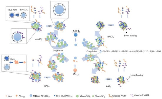 Actually, natural water bodies are complex and multi-component systems, so emerging pollutants such as particulate matter, microplastics and nanoplastics (MNPs), perfluorinated compounds and antibiotics present in them can all affect the floc aging process. It has been shown that flocs containing particulate matter of various sizes exhibit differences in the types and amounts of organic matter absorbed or released during the aging process. Figure 5 illustrates how particle size affects the floc activity. Although flocs containing nano-silica (nSiO2) and micro-silica (mSiO2) both release humic substances during aging process, the humic substances released by nSiO2 flocs are more aromatic. Furthermore, mSiO2 flocs tend to absorb low-molecular-weight neutrals (LWM-N), whereas nSiO2 flocs struggle to absorb macromolecules and LWM-N. This is attributed to the varying number of ≡Si-OH groups distributed on the surfaces of particulate matter with distinct sizes. It has been reported that ≡Si-OH can promote hydroxyl-bridge reactions with ≡Al-OH, thereby reducing floc activity. This is further supported by the observation that more OH− is released from mSiO2 flocs [25]. Therefore, the mSiO2 system with fewer ≡Si-OH groups provides more adsorbable ≡Al-OH active sites for NOM, enabling it to absorb more LWM-N during aging. Moreover, ≡Si-OH groups tend to adsorb water molecules, which may hinder the binding between NOM and flocs. The lower floc strength formed by nSiO2 compared to that formed by mSiO2 further substantiates this point [87]. Consequently, nSiO2 adsorbs bound water more easily than mSiO2, leading to a higher release of organic matter from the nano-system [88].