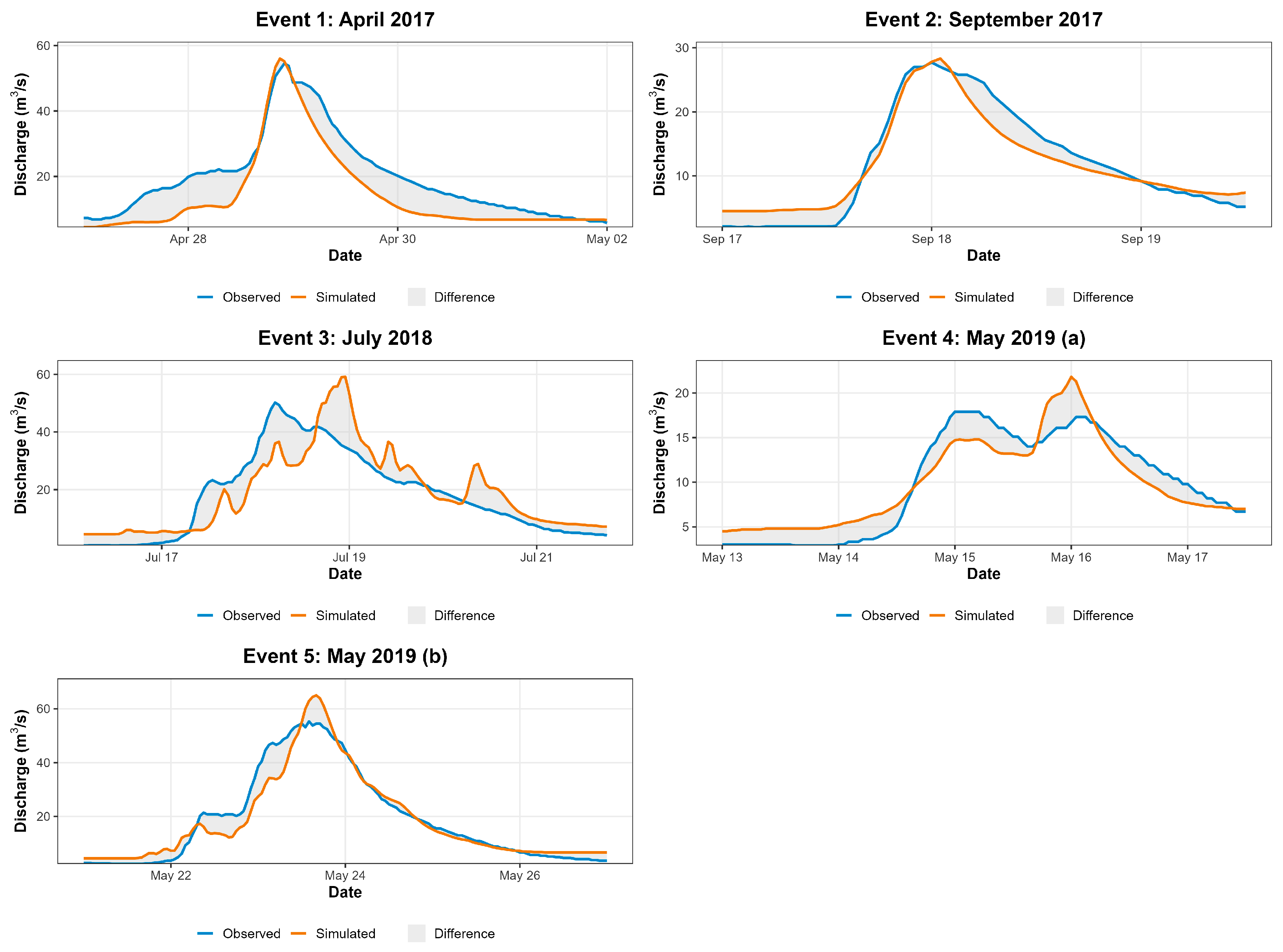 | Event 5: May 2019 (b) | 0.92 | −1.43 | 0.28 | NSE: Very good PBIAS: Very good RSR: Very good |