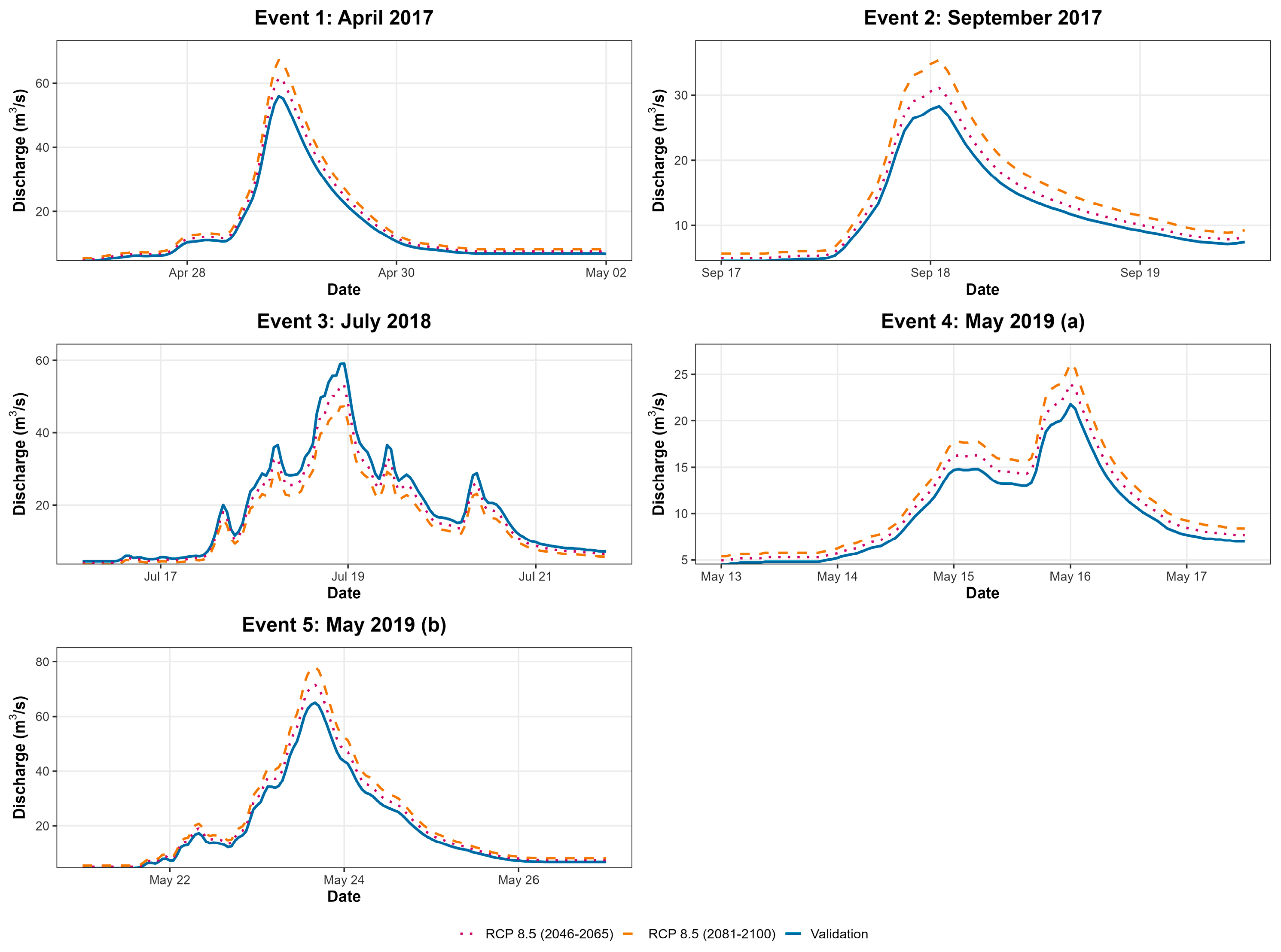 - The intensity of the hydrological response is strongly correlated with the emissions pathway, with the RCP8.5 scenario projecting flood peak increases approximately double the magnitude of those under RCP4.5.