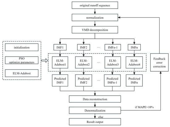 The flowchart of the VMD-ELM-AdaBoost Runoff Prediction Method.