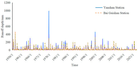 Monthly runoff depths at Yanshan and Baiguishan stations from 1956–2022.