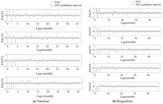 Considering Yashan Station as an example, the VMD of the original monthly runoff sequence produced four subsequences. Figure 6 illustrates the calculated input lag lengths for subsequences 1, 2, 3, and 4, which were determined to be 5, 4, 4, and 4 months, respectively, using PACF analysis.