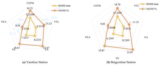 Radar charts comparing the prediction accuracy results of different models at (a) Yanshan Station and (b) Baiguishan Station.