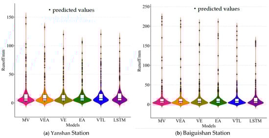 Regarding the extreme value intervals, except for LSTM, the lengths of the outlier intervals of the other prediction methods are close to those of the measured values, while the outlier interval of LSTM is relatively shorter. Except for the VMD-ELM-AdaBoost model, the other models show larger differences between their outlier intervals and those of the measured values, especially in the prediction of runoff volumes greater than 100 mm, where the differences between the prediction results and the measured values are more pronounced.
