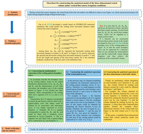 Flowchart of the construction process of the analytical model for the three-dimensional wetted bulb under vertical line-source irrigation. Figure citation ‘Fan et al. (2018)’ refers to reference [25].
