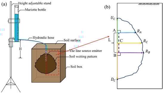 Figure 2 was drawn to clearly show the physical context of the study and the corresponding relationships of key infiltration parameters. Figure 2a shows the vertical line source irrigation experimental setup used by Fan et al. [25], The experiment device consists of five parts: a height adjustable stand, a mariotte bottle, a hydraulic hose, a line source emitter, and a soil box.
