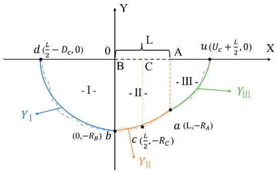 First, to construct the mathematical expressions of the wetting pattern boundary curves, we referred to the method proposed by Kilic [10]. The soil wetting pattern in Figure 2b was rotated 90 degrees clockwise, and a Cartesian coordinate system was established with point B as the origin, forming the geometric structure shown in Figure 3.