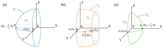 According to the structure shown in Figure 5, the three-dimensional wetted bulb was formed by rotating the function curves , and around the x-axis. To further analyze the volume composition, the volume expressions formed by the rotation of each curve are derived one by one below.