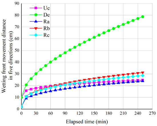 As shown in Figure 7, the migration distance of the wetting front in the Dc direction was always significantly greater than that in other directions. This trend was consistent with the numerical results reported by Fan et al. [24] for the vertical line source irrigation condition, where the wetting pattern showed an approximately ellipsoidal distribution with dominant vertical extension under gravity. Unlike traditional point-source models [5,8], Vertical line source irrigation represented a line-source water supply. Its geometric boundary and supply mode were fundamentally different, so the wetted bulb showed distinct spatiotemporal evolution characteristics compared with point-source conditions. Kilic [10] proposed a three-dimensional analytical model based on point-source drip irrigation to predict the wetted bulb volume. He found that under point-source drip irrigation, the wetted bulb was more evenly distributed horizontally. This differed from the results in Figure 7, indicating that continuous line-source water supply could more effectively promote the formation of deeper wetted zones, showing a different infiltration behavior from that of point-source drip irrigation.