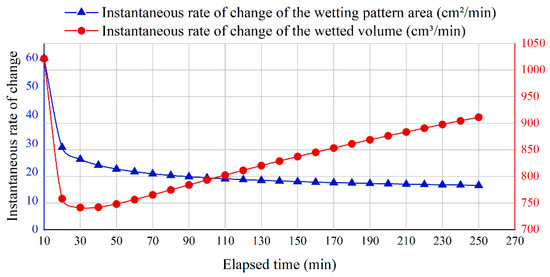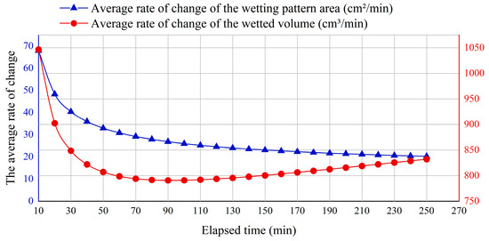 As shown in Figure 8 and Figure 9, the change rate of the area continuously decreased throughout the irrigation process, indicating that water diffusion gradually slowed down, and the area of the wetting pattern tended to stabilize. In contrast, the volume change rate first dropped to its lowest point (around 30 min) and then gradually increased. This suggests that water mainly migrated in the vertical downward direction after that, resulting in a continuous increase in the thickness of the wetted bulb, which in turn drove the continued growth of the total volume.