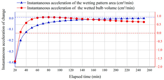 Figure 10 and Figure 11 showed the changes in instantaneous and average acceleration of the wetted pattern area and soil wetted bulb volume over time. As shown in Figure 10, the instantaneous acceleration of the wetted pattern area remained negative and gradually approached zero. In contrast, the instantaneous acceleration of the soil wetted bulb volume changed from negative to positive at about 30 min, reached its peak at around 70 min, and then slowly decreased.