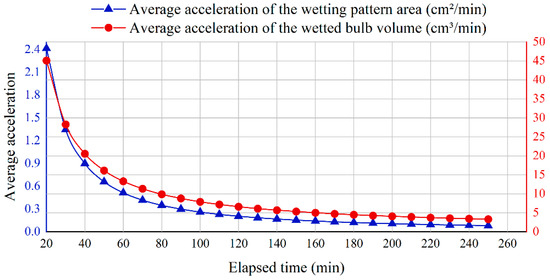 The instantaneous acceleration of the wetting pattern area () and the wetted bulb volume ().