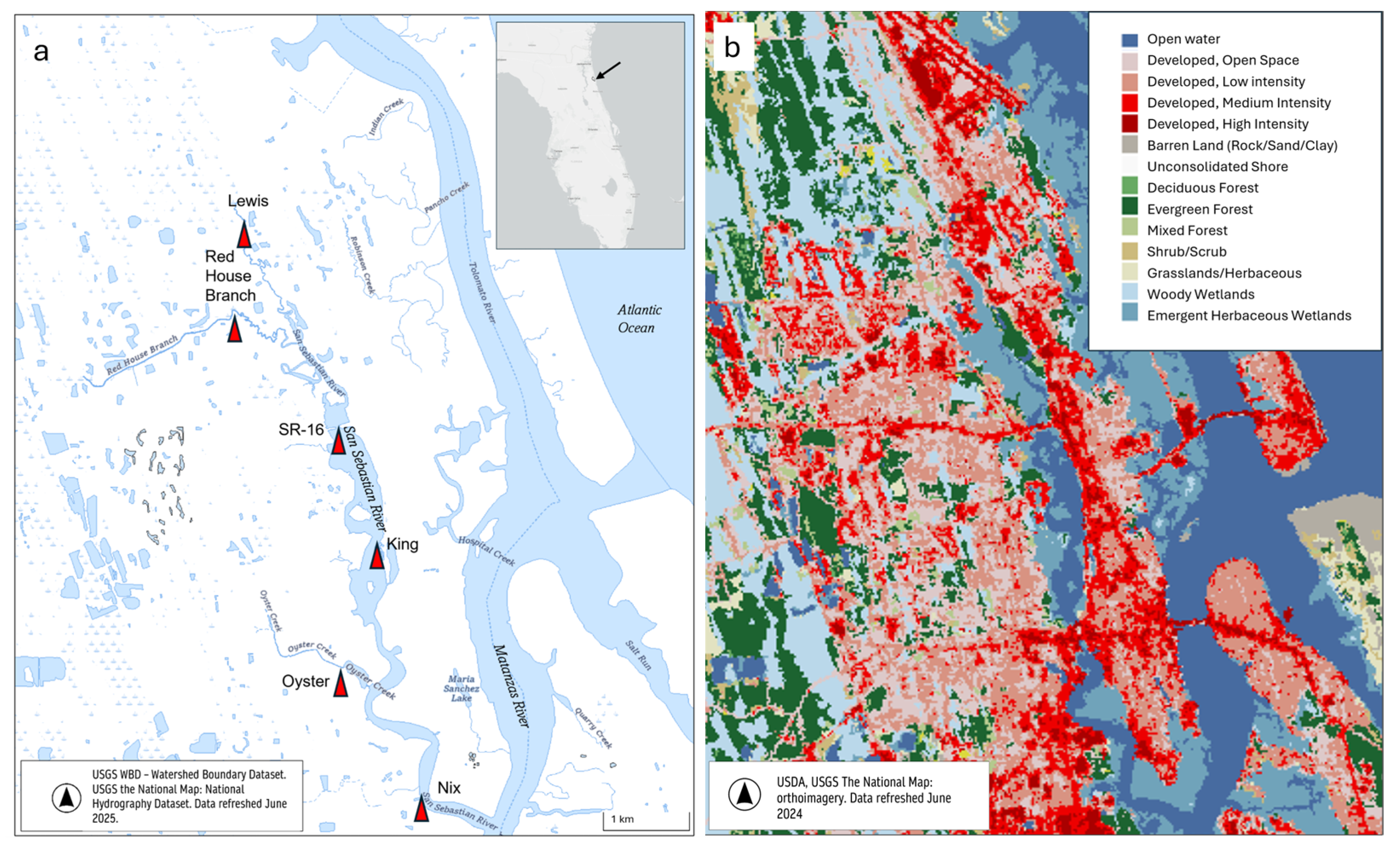- Statistics for San Sebastian River at St. Augustine, FL—USGS Water Data for the Nation. Available online: https://waterdata.usgs.gov/monitoring-location/USGS-02246895/statistics/ (accessed on 22 July 2025).