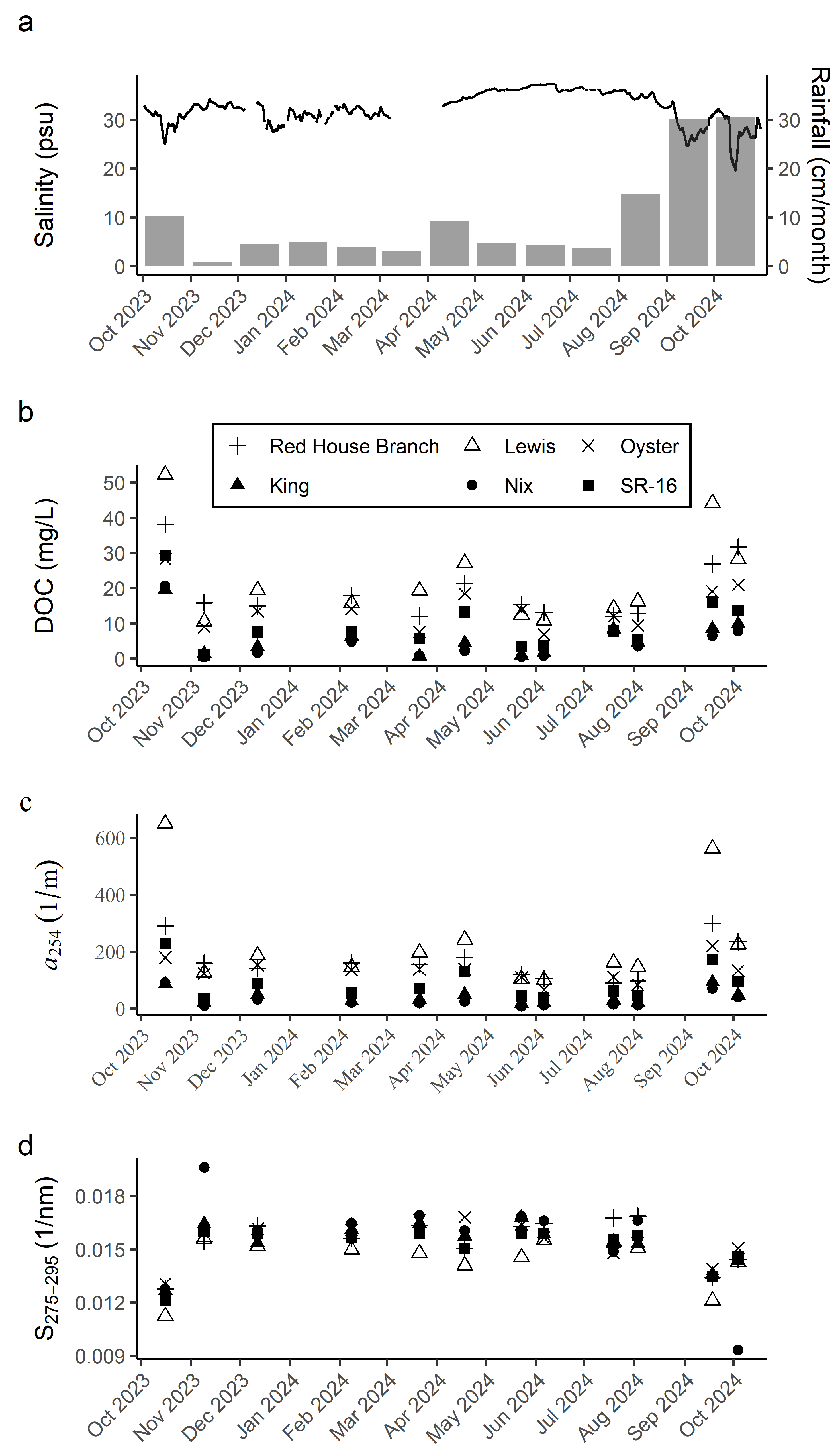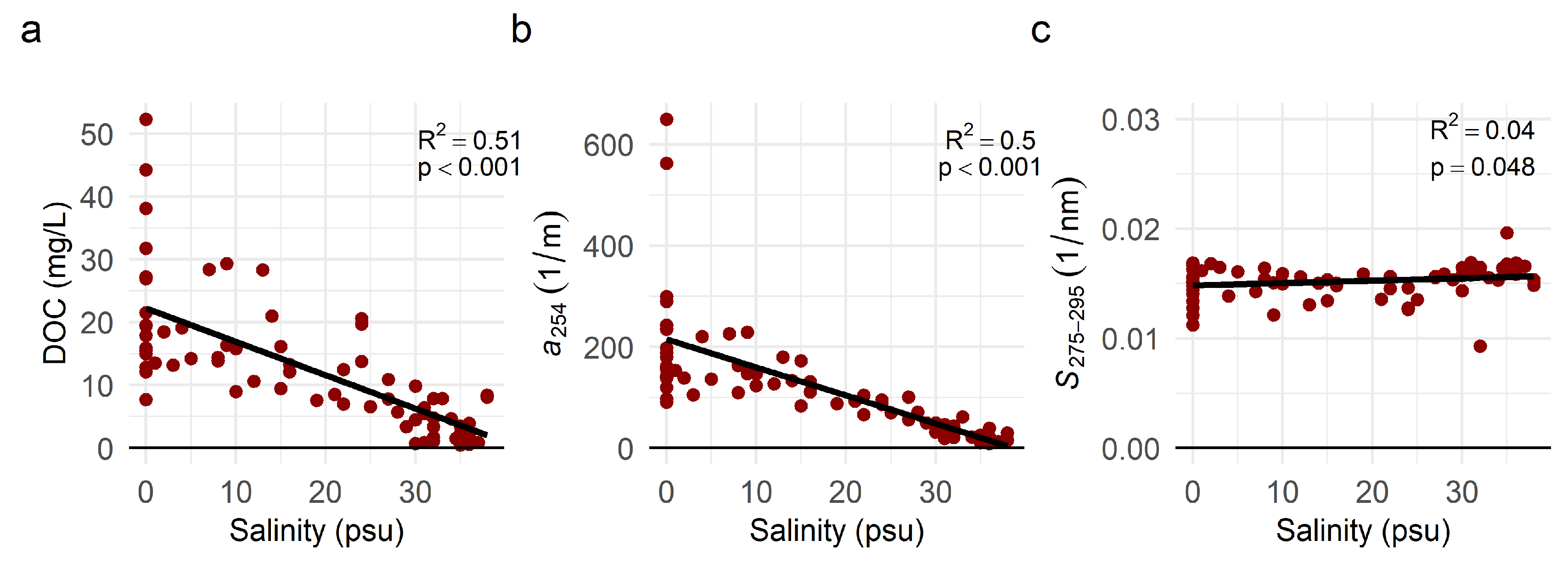 | Site | Salinity (psu) | DOC (mg/L) | 254 (1/m) | 280 (1/m) | 325 (1/m) | 355 (1/m) | 440 (1/m) | SR | S275–295 (1/nm) | S350–400 (1/nm) | SUVA254 (L/mg/m) |