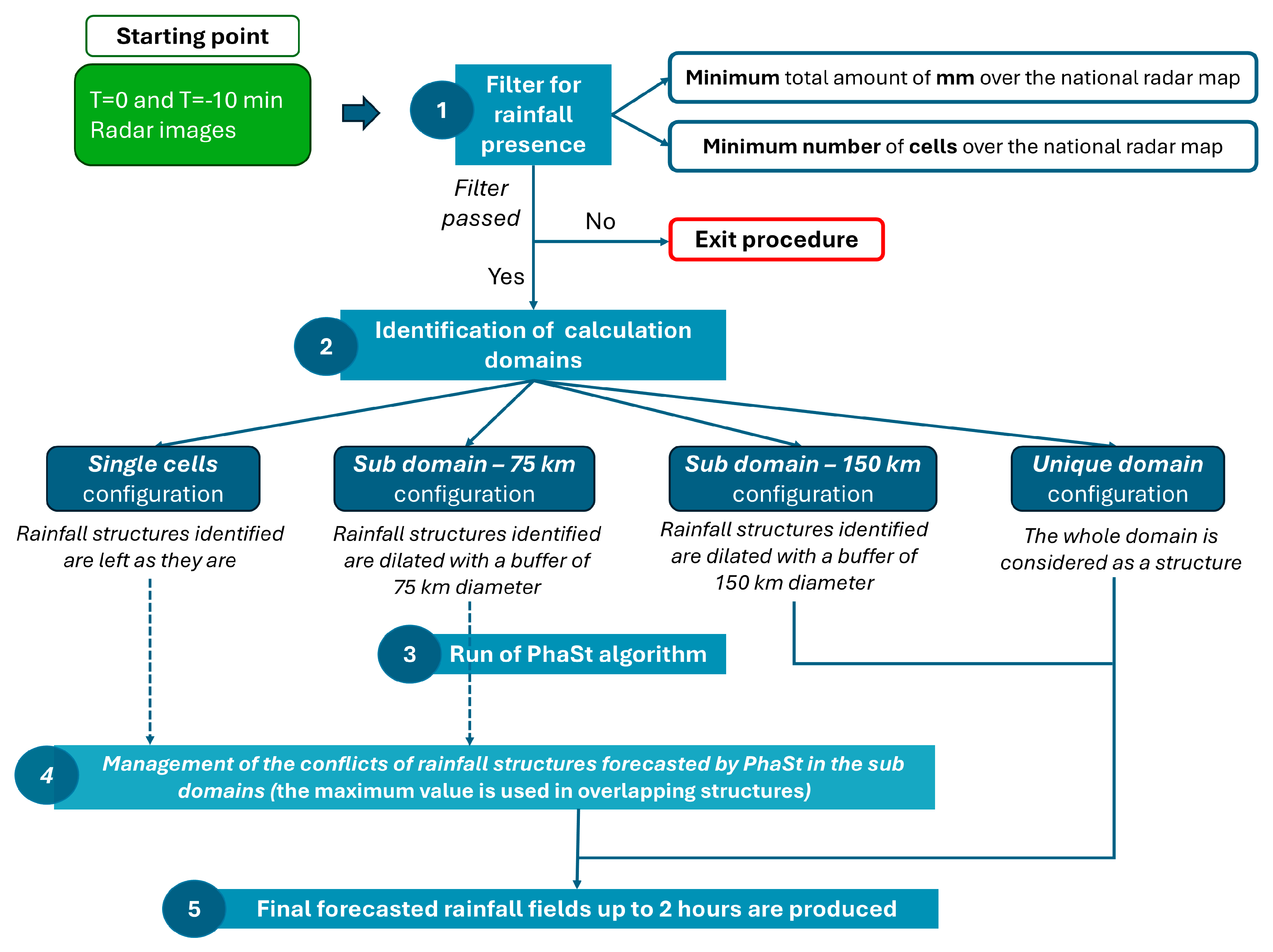 The considered nowcasting method is called PhaSt, a probabilistic method that uses as input the rainfall fields derived by radar systems [25], routinely 2 maps at times t and t – 1; it generates an ensemble of rainfall scenarios, and its original formulation is described in [10]. The rainfall fields are Gaussianized by sorting rainfall values and replacing them with sorted values obtained by sampling a Gaussian distribution. The new fields are transformed with Fast Fourier Transform in the phase and amplitude space, where each spatial scale is propagated with its own phase velocity, and then, through the inverse Fast Fourier Transform, the field is transformed back into the physical space.
