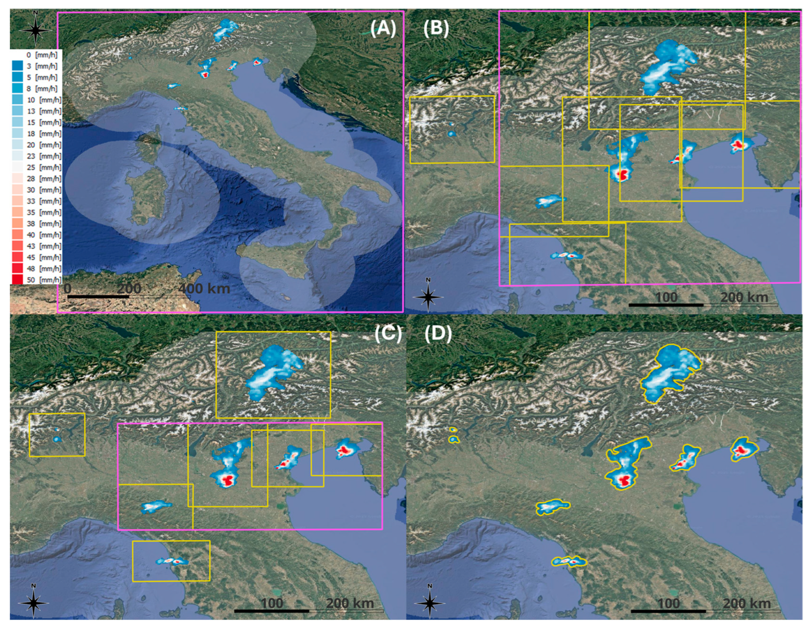 The literature shows some interesting nowcasting studies at the Italian scale that mainly rely on the aforementioned methodologies; Mazza et al. [20] used a Lagrangian advection scheme with a particular focus on the analysis of central Italy and Poli et al. [21] presented the usage of Py-STEPS using national radar data at the RadMet2021 conference, while the Gregori et al.’s thesis [22] shows a useful comparison of nowcasting methods at a national scale.