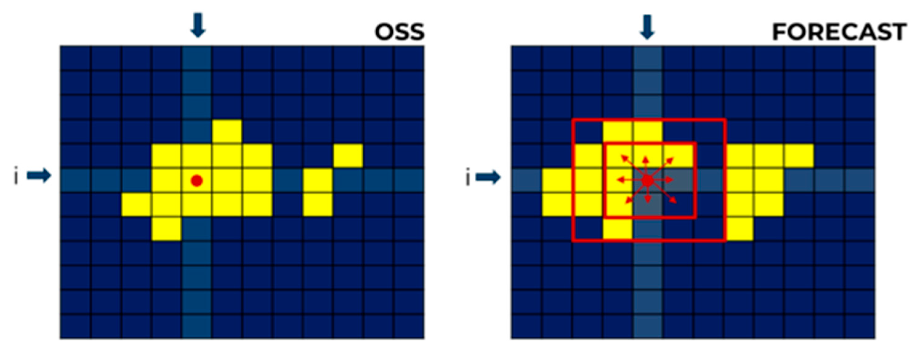 The Hits, False Alarms, and Miss events have been calculated starting from the forecasted rainfall fields cumulated at an hourly scale and applying four thresholds (1-5-10-20 mm) to them. This choice is mainly due to the fact that the analysis is carried out with a hydrological perspective where rainfall accumulations are generally considered. Using the dichotomous matrix, the observed and forecasted rainfall maps have been compared, following a simple method inspired by the literature [30,31] in order to overcome the “double penalty effect”, according to which a forecasted rainfall field with correct size and structure of main rainfall cells but slightly wrong positioning can lead to very low verification scores. Hence, to overcome the “pixel to pixel” verification and avoid penalization due to small errors in positioning of the structures (resulting in more misses and false alarms), the scores have been calculated counting hits, false alarms and misses using buffers (Figure 4). This would also be consistent with the final operational purpose of the analyzed procedure: the criticality messages for civil protection purposes connected to heavy rainfall at the Italian scale are issued at municipality level, with an average dimension that can vary from less than 10 km2 to over 100 km2. For this reason, an accuracy at “pixel” level is unnecessary for this kind of application and a good compromise in the analysis is represented by the current use of the buffer verification.