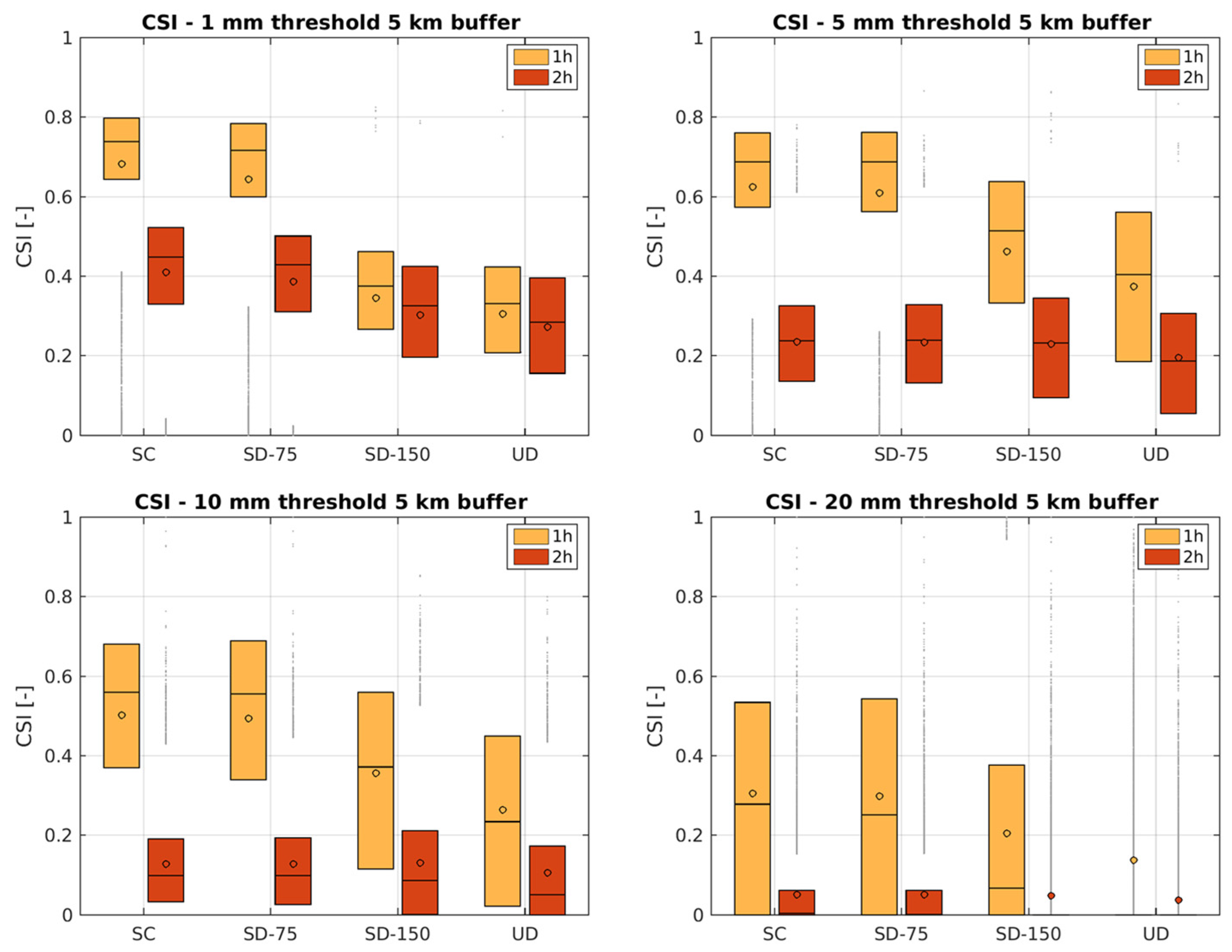 CSI results for 5 km buffer. Rainfall accumulated in the first and second hour. Each boxplot represents the variability of CSI values for the 4 considered configurations: SC, SD-75, SD-150, UD.