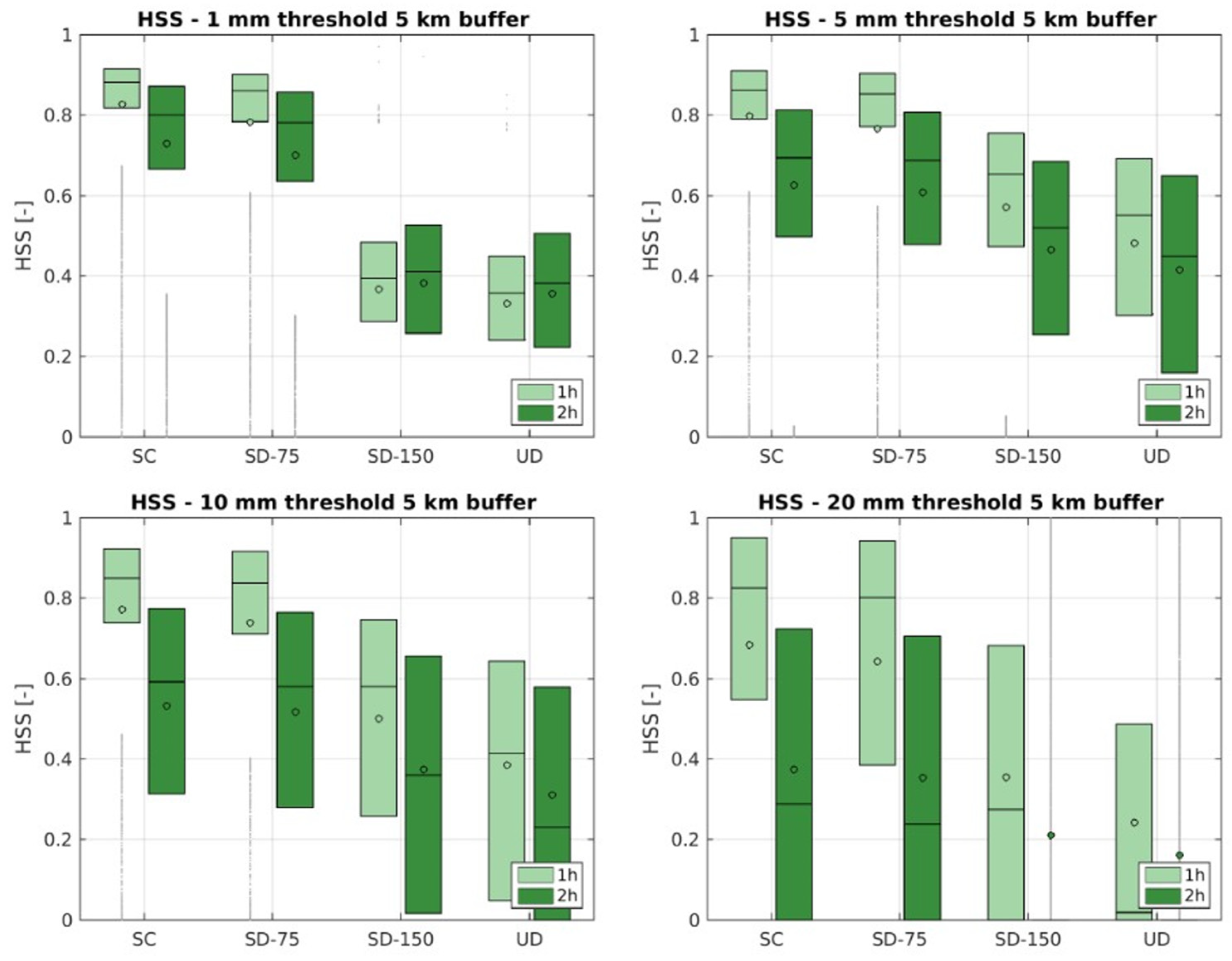 HSS results for 5 km buffer. Rainfall accumulated in the first and second hour. Each boxplot represents the variability of HSS values for the 4 considered configurations: SC, SD-75, SD-150, UD.