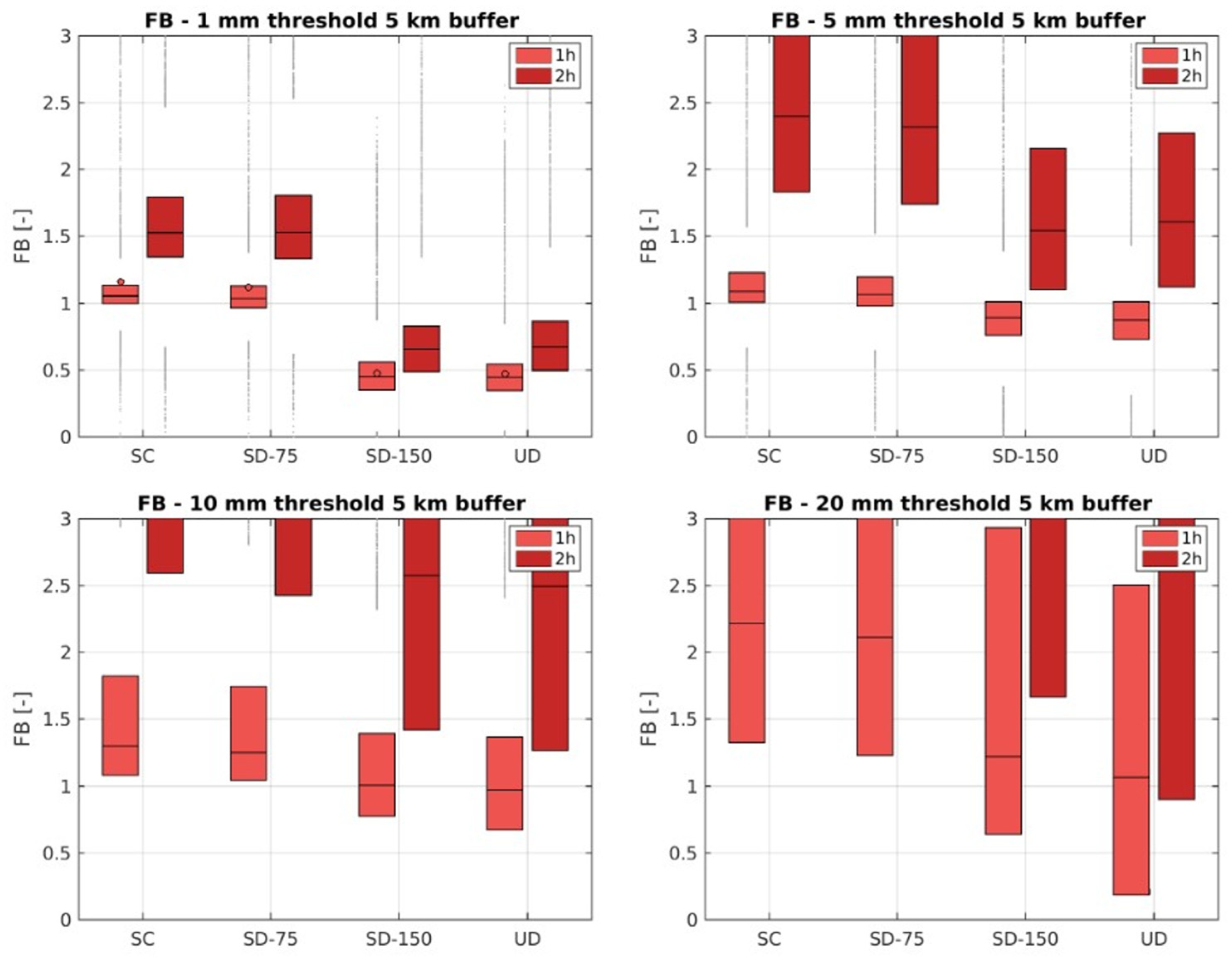 FB results for 5 km buffer. Rainfall accumulated in the first and second hour. Each boxplot represents the variability of FB values for the 4 considered configurations: SC, SD-75, SD-150, UD.