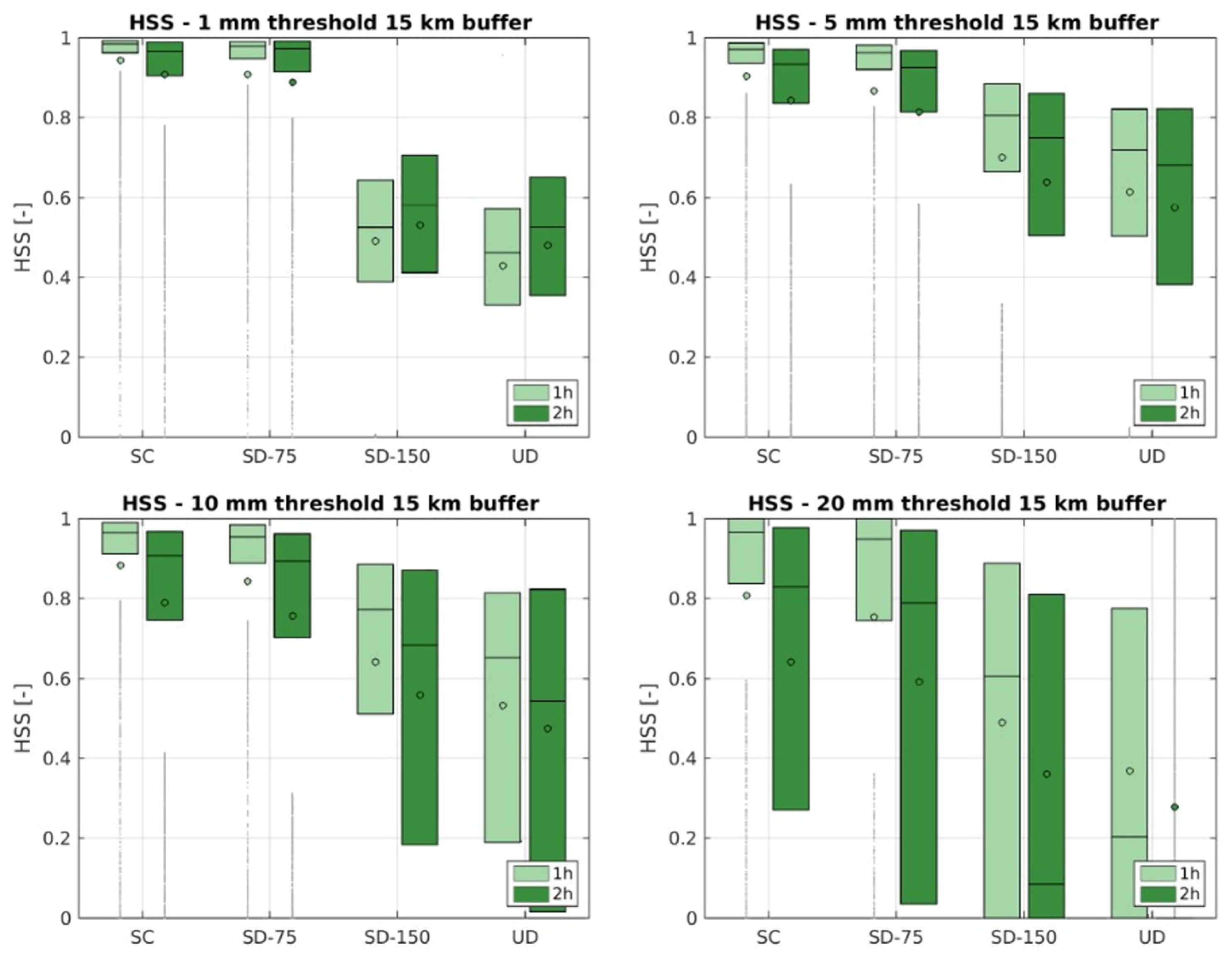 HSS results for 15 km buffer. Rainfall accumulated in the first and second hour. Each boxplot represents the variability of HSS values for the 4 considered configurations: SC, SD-75, SD-150, UD.