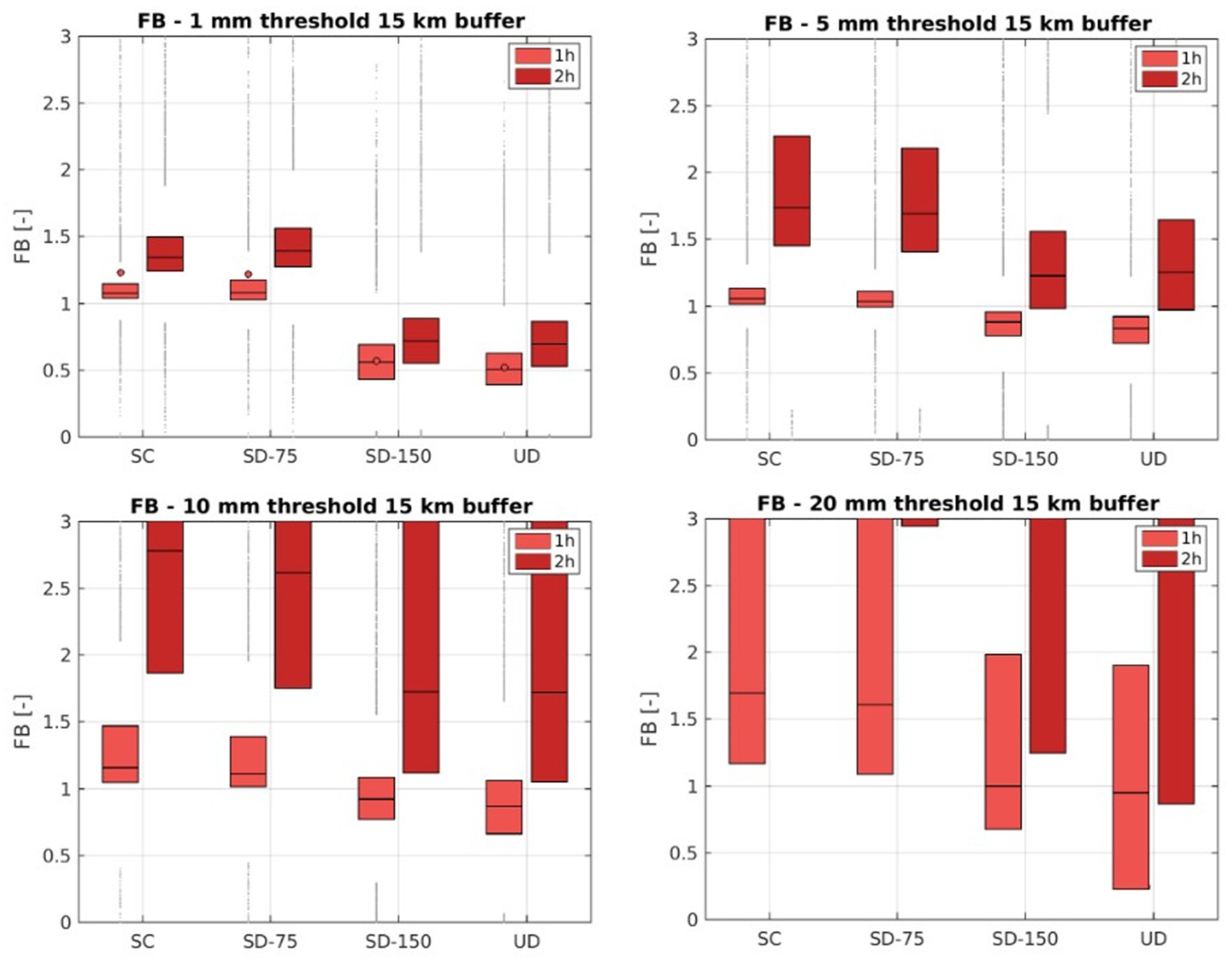 FB results for 15 km buffer. Rainfall accumulated in the first and second hour. Each boxplot represents the variability of FB values for the 3 considered configurations: SC, SD-75, SD-150, UD.