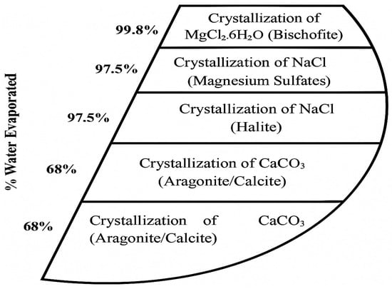 Using solar energy to evaporate brine is a low-cost and straightforward method that is widely used in salt production worldwide. Desalination brine, already twice as saline as seawater, can be fed into a sequence of ponds where water gradually evaporates and different salts precipitate in order of their solubility. Typically, CaCO3 and CaSO4 precipitate at slight supersaturation, often as scale or sludge, then NaCl crystallizes once the brine reaches 25% salinity, which is the saturation point of halite at warm temperatures [20]. After NaCl is harvested, the remaining bittern is enriched in magnesium and potassium salts, which can yield minerals like carnallite, which is a mixture of KCl·MgCl2·6H2O, or bischofite MgCl2·6H2O, and eventually magnesium sulfate salts once water is almost fully evaporated [20]. Figure 2 illustrates a typical sequence of mineral precipitation from seawater as water is removed.