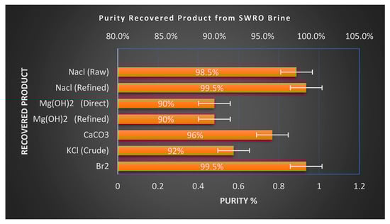 For example, sodium and chloride can be recovered as high-purity sodium chloride (NaCl) salt, a commodity for de-icing, food in chemical industries, or which can be separated to produce chlorine gas and caustic soda. Magnesium can be recovered as magnesium hydroxide (Mg(OH)2) or magnesium oxide, which are used in water treatment, refractory materials, and as precursors for magnesium metal [21,22]. Calcium could be harvested as calcium carbonate or gypsum (CaSO4·2H2O) for use in construction and agriculture. Potassium is a valuable fertilizer component, as is KCl or potassium sulfate. Even minor constituents like bromide and boron have niche markets, such as bromine for flame retardants and boron in boric acid for industrial use. Recovering these from brine can reduce the reliance on terrestrial mining for the same elements, some of which are classified as critical raw materials due to supply risks [4,23]. Mohammad et al. [24] extracted magnesium from desalination brine using ammonium hydroxide, obtaining Mg(OH)2 of over 95% purity. Their experiments, however, showed that complete conversion was not achievable, with the maximum recovery recorded at 97%. Sadhwani et al. [16] examined case studies from the Canary Islands, where reverse osmosis was the primary desalination method. Their analysis highlighted potential environmental impacts, including increased energy consumption linked to global warming, noise emissions, land-use pressures, and harmful effects on marine ecosystems. According to Shemer and Semiat [17], the brine discharged from desalination facilities in the Arabian Gulf contributes to increasing seawater salinity levels, reducing dissolved oxygen concentrations and threatening marine stability.